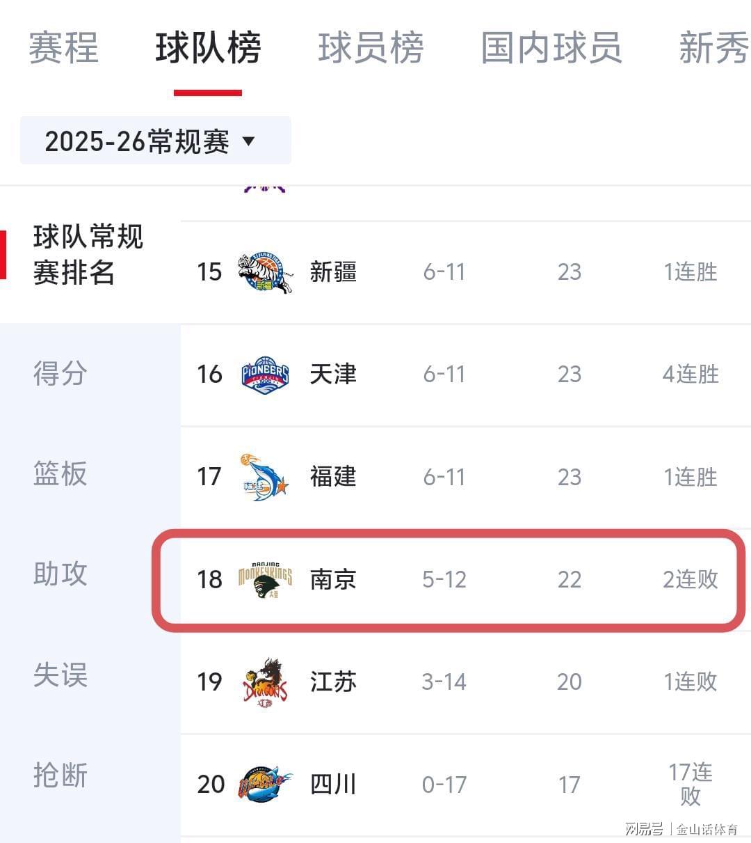 值得一提的是,本赛季开打前,南京同曦官方社媒公示,球队原主帅贝西洛维奇由于家庭原因主动辞职,原助教、前浙江队主帅王世龙接替成为球队新任主教练。然而,王世龙接过教鞭后,并没给这支“青年军”带来改变,球队反而在开赛后一路走低,遇强则弱,遇弱不强,打谁都费劲吧啦,截止目前,同曦队以5胜12负的惨淡战绩,排名积分榜倒数第3位。